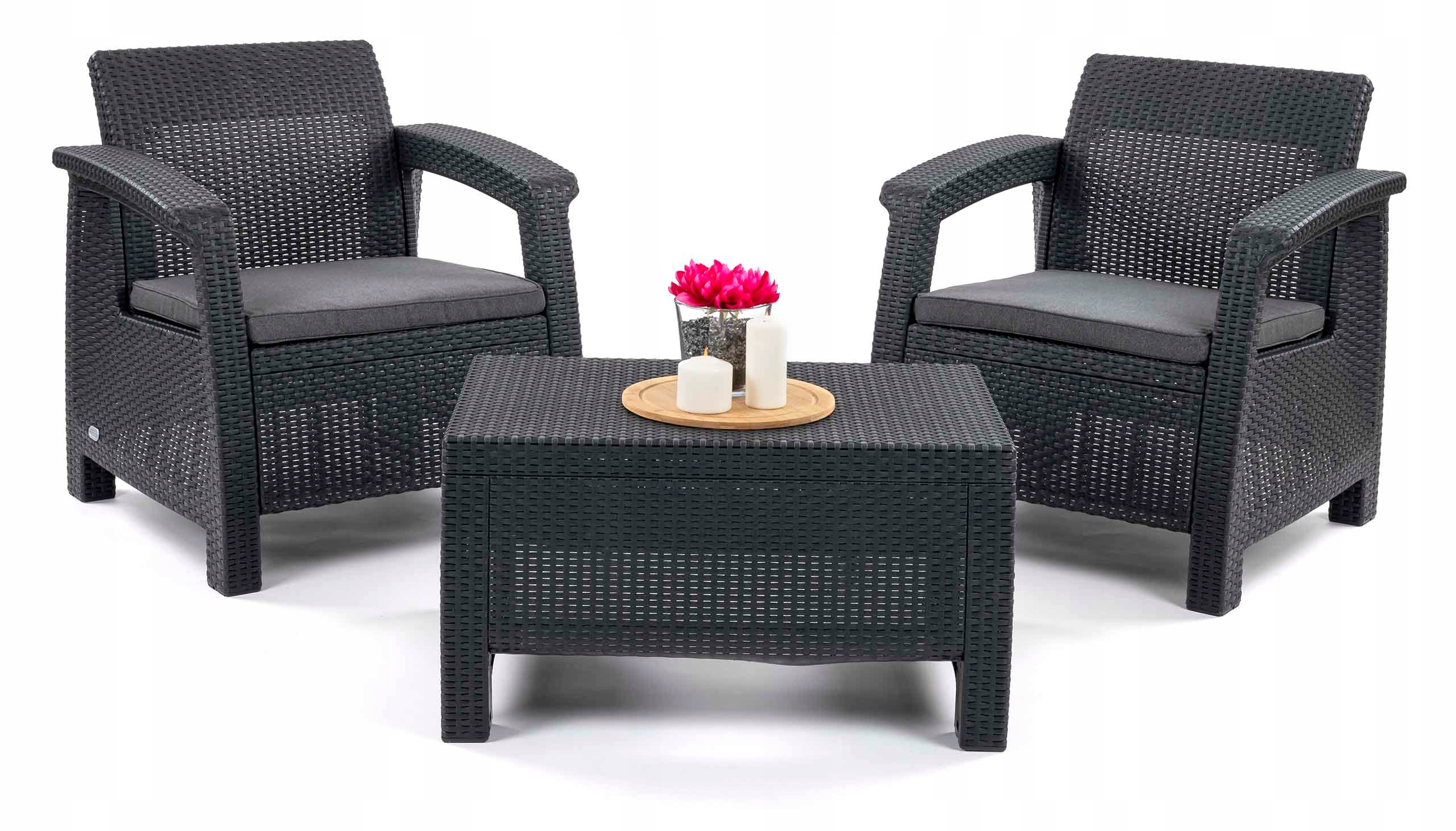 Corfu WEEKEND grafit to funkcjonalny i wyjątkowo stylowy zestaw mebli ogrodowych, w którego skład wchodzą dwa wygodne fotele oraz praktyczny stolik kawowy. Nowoczesny design inspirowany plecionką rattanową sprawia, że komplet doskonale prezentuje się w ogrodzie, na tarasie, balkonie czy w przestrzeni kawiarnianej. Dzięki ponadczasowej estetyce zestaw idealnie uzupełni każdą aranżację strefy wypoczynkowej.
