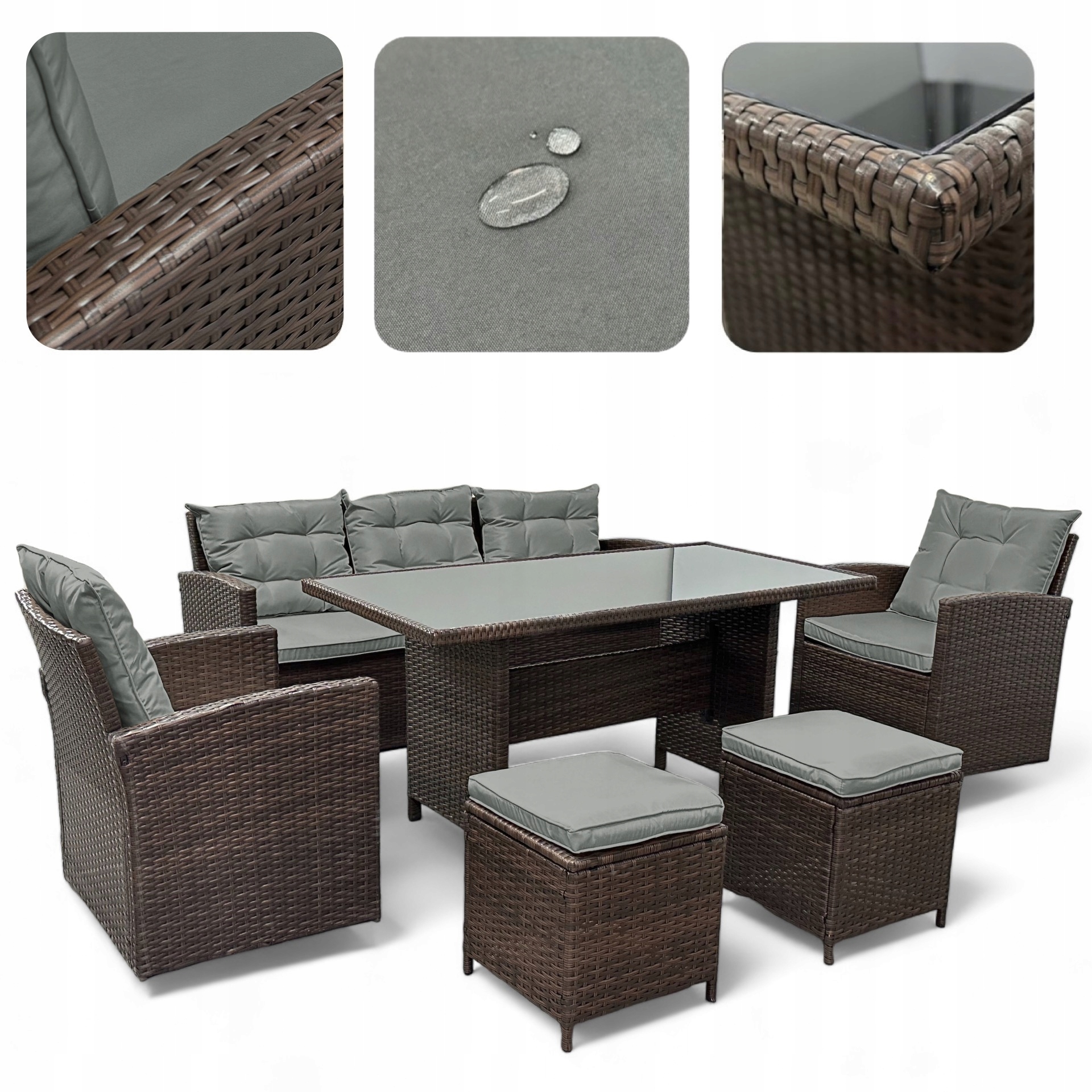 - ✅ Kompletne wyposażenie XXL: Zestaw składa się aż z 8 elementów (sofa, 2 fotele, 2 pufy, wysoki stół oraz komplet poduszek), co pozwala na komfortowe ugoszczenie nawet 8 osób jednocześnie.